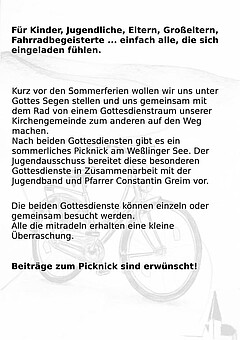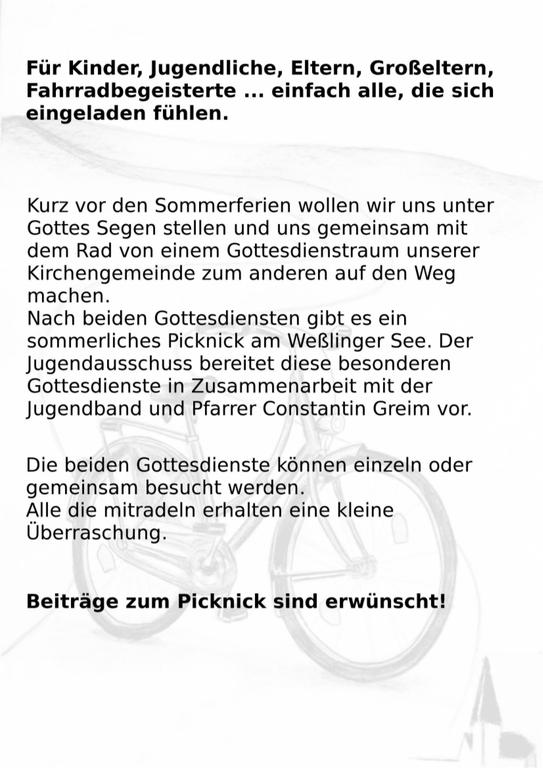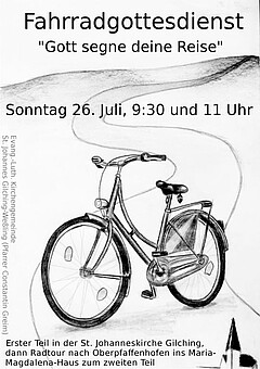 Am Sonntag, den 26. Juli, um 9.30 und 11 Uhr findet durch die Evang.-Luth. Kirchengemeinde St. Johannes Gilching-Weßling ein Fahrradgottesdienst statt.