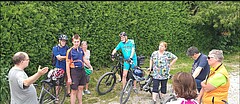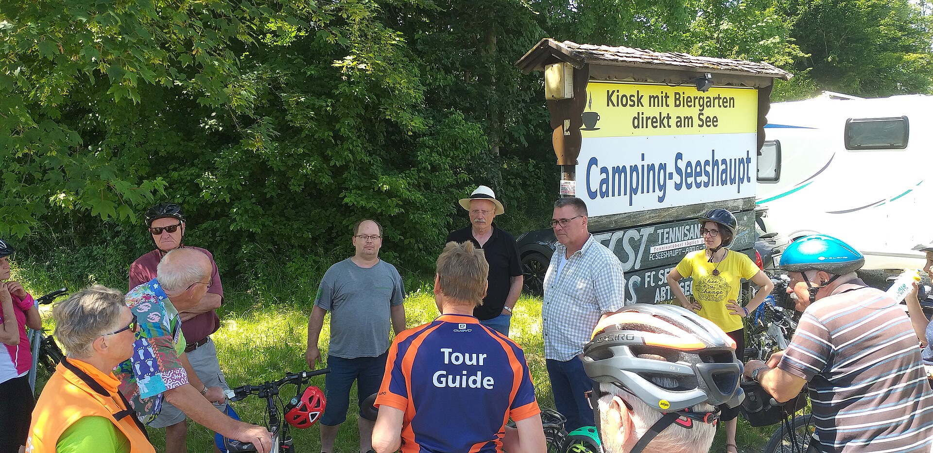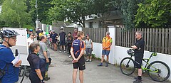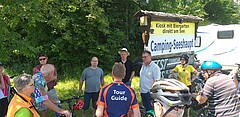 Für die Gemeinde Münsing treffen die Radler den Gemeinderat Herrn Prof. Richter-Turtur und den Autor und Redakteur Manfred Hummel an der Fischerei Sebald in Ammerland.
