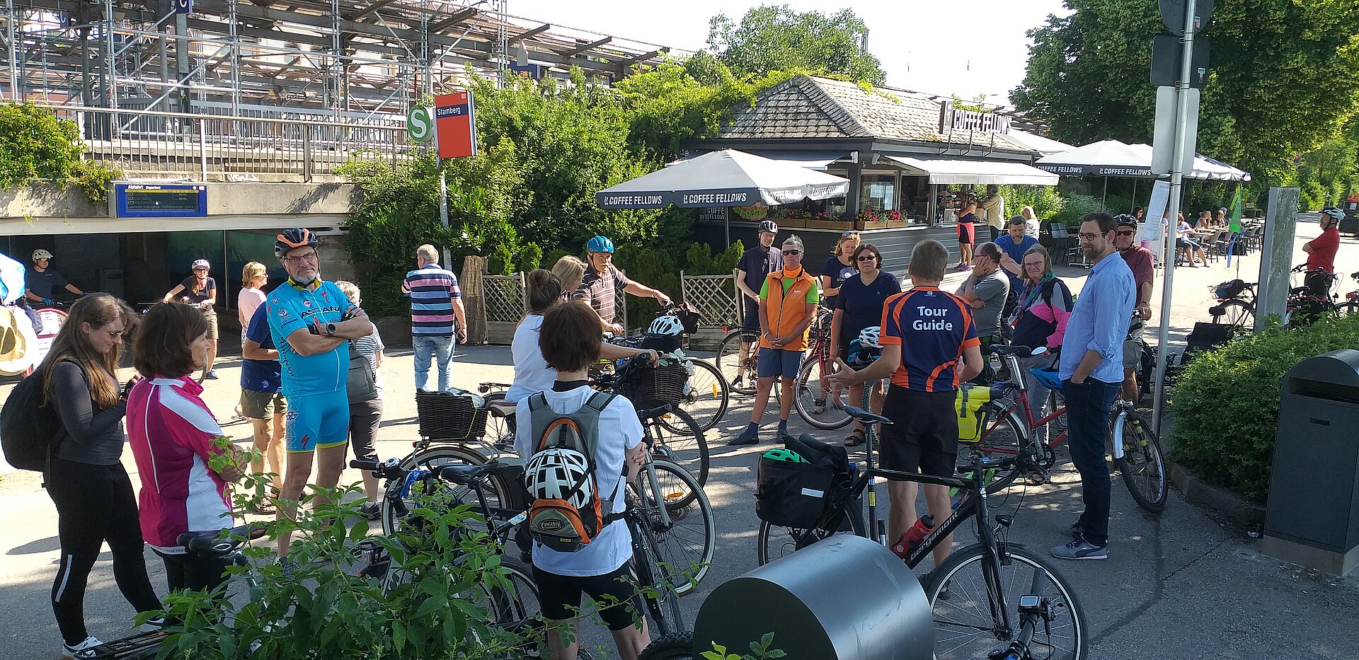 Beim Dampfersteg in Berg erwartete Bürgermeister Rupert Steigenberger die Radlgruppe. Er berichtete, dass sich die Radschutzstreifen auf der Perchastraße bewährt haben, nur der Seitenwechsel ist für Radelnde am Kreisverkehr und an der Aufkirchner Straße etwas schwierig. Der Kreisverkehr am Ortseingang reduziert erkennbar die Fahrgeschwindigkeit der Kraftfahrzeuge und verbessert so die Sicherheit in der Ortsdurchfahrt. Im Süden der Gemeinde wird der Lückenschluss des Radwegs nach Münsing leider erst bis 2024 mit der Fahrbahnerneuerung fertiggestellt. Die Uferstraße, die sich Fußgänger, Radler und Anwohnerautos teilen müssen, erfordert von allen etwas Rücksicht, macht aber wenig Probleme. Der Zweirichtungsradweg in Kempfenhausen, Perchastraße ist unfallträchtiger, weil unübersichtliche Einmündungen, unterschiedliche Geschwindigkeiten und viele Verkehrsteilnehmer auf dem engen Raum schwer aneinander vorbeikommen. Wenn hier die schnelleren Radfahrer/innen auf der Fahrbahn geführt würden, wäre die Gefahrsituation auf dem Gehweg deutlich entschärft.